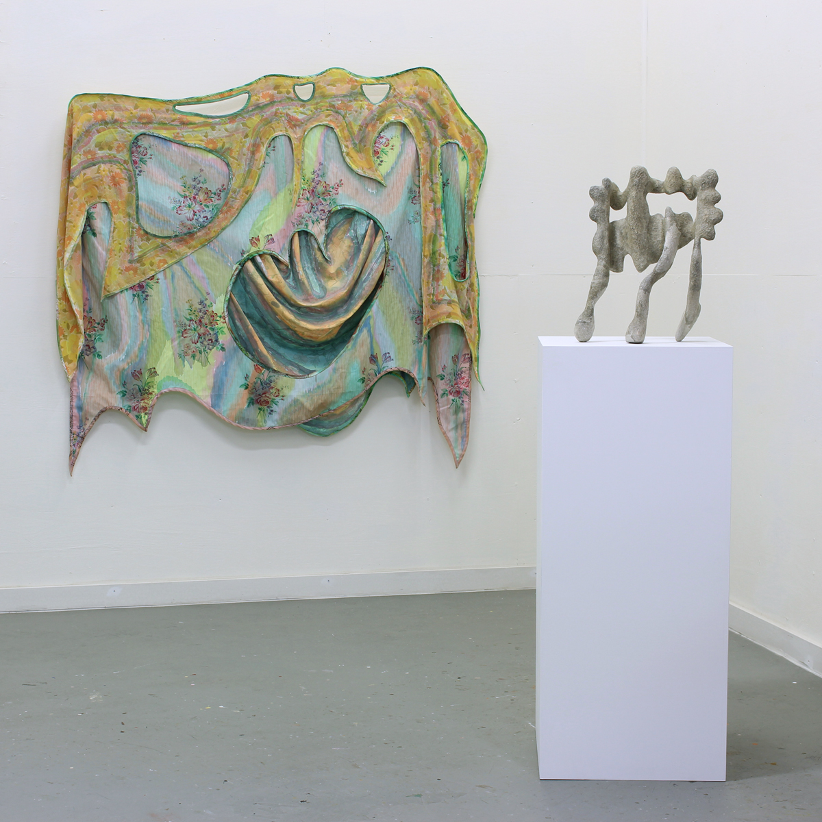 My art includes painting, sculpture, and textile-based works called Draperies. In my distinctive bodies of work, I explore notions of femininity and feminism, high and low forms of making, and dreams and disasters. Through my use of everyday materials including used bed sheets and newspapers, I transform materials typically on their way out the door into an opportunity to elevate and extend experiences of liminality. Accumulation is integral to my process and partly what my work is about. Dated bed sheets act as windows for peering into specific times from the past. The surface of a bed is a place where one both experiences and escapes reality, a gateway between two realms. My approach to making is improvisational within the constraints I define. I want to strike a balance between chaotic gestures and structure. I’m interested in exploring psychological themes through abstraction. Feminism informs and supports how I make and the materials and techniques I choose to work with. My paper pulp sculptures, made from newspapers and miscellaneous papers, are carefully constructed to combine floral forms with loose interpretations of bodily movements. Working with my own mix of pulped-up papers refers to the newsfeed and information overload. Influenced by clothing construction, the human body, curtains, windows, and cycles in nature, my work is a material exploration of the immaterial.