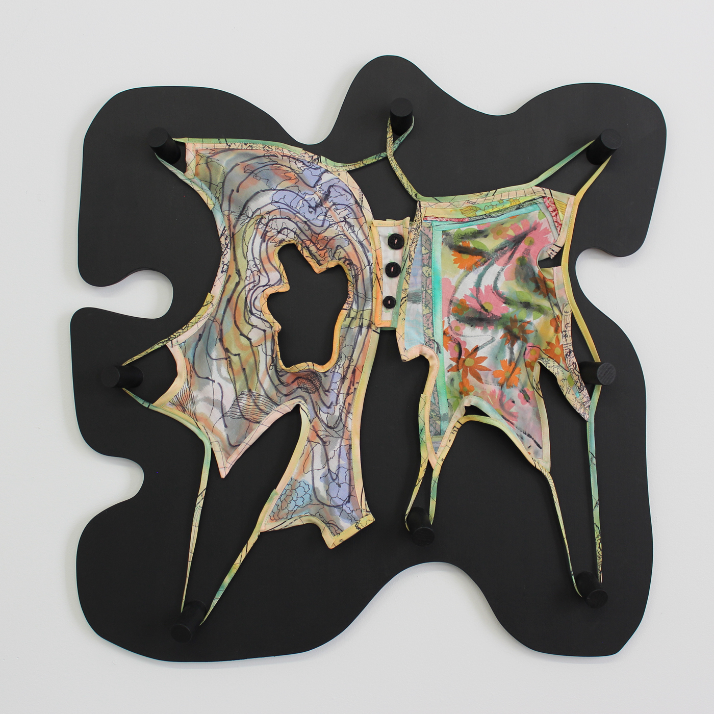 Acrylic, bedsheets, permanent marker, rose petal buttons, thread, wood